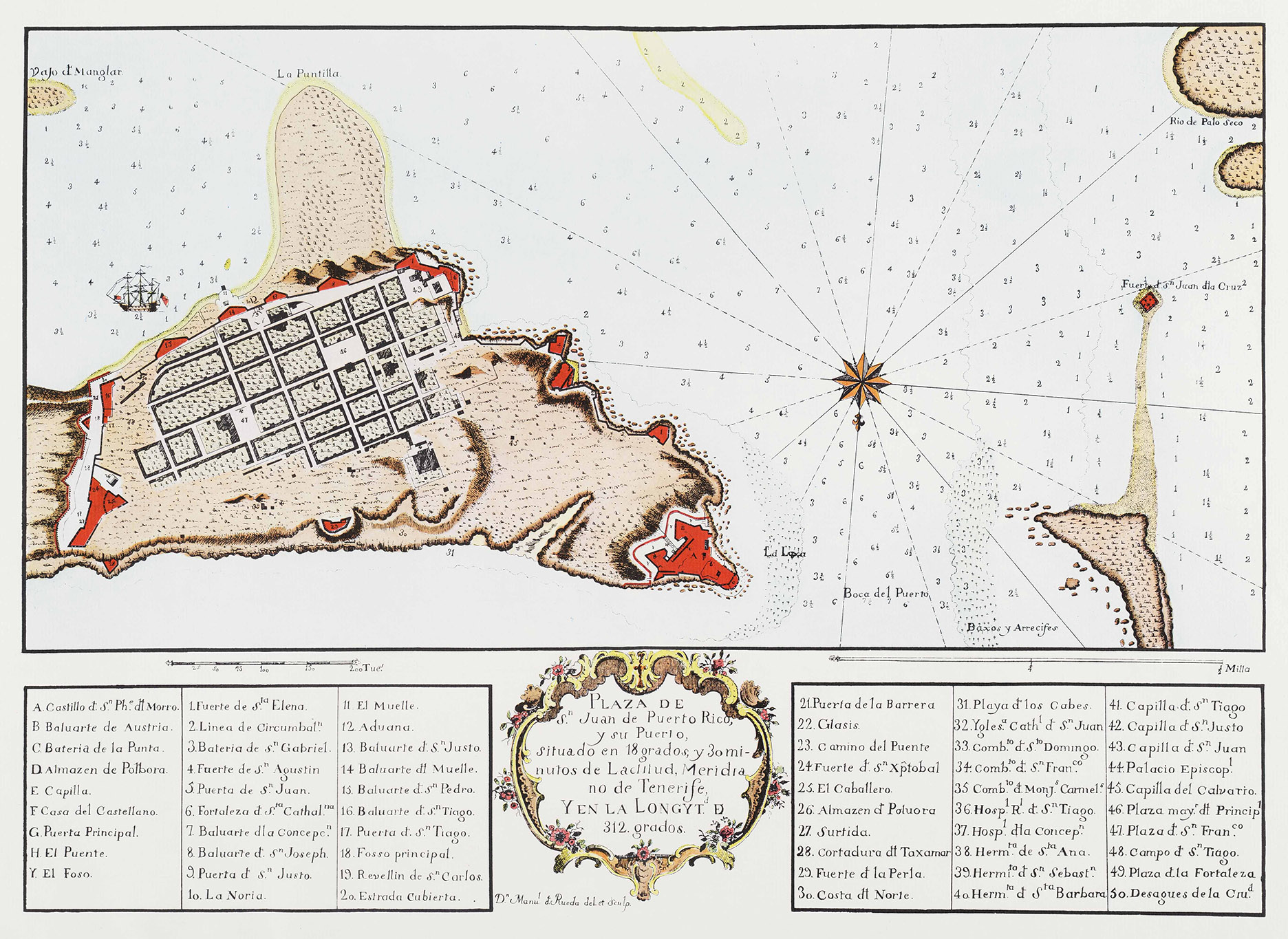 Mapa de la plaza de San Juan de Puerto Rico hecho por Don Manuel de Rueda circa 1766. La descripción que aparece en el mapa lee: Plaza de Sn. Juan de Puerto Rico, y su puerto, situado en 18 grados, y 30 minutos de Lactitud, Meridiano de Tenerife y en la Longytd. de 312 grados. Dn. Manul. d. Rueda, del. et sculp.