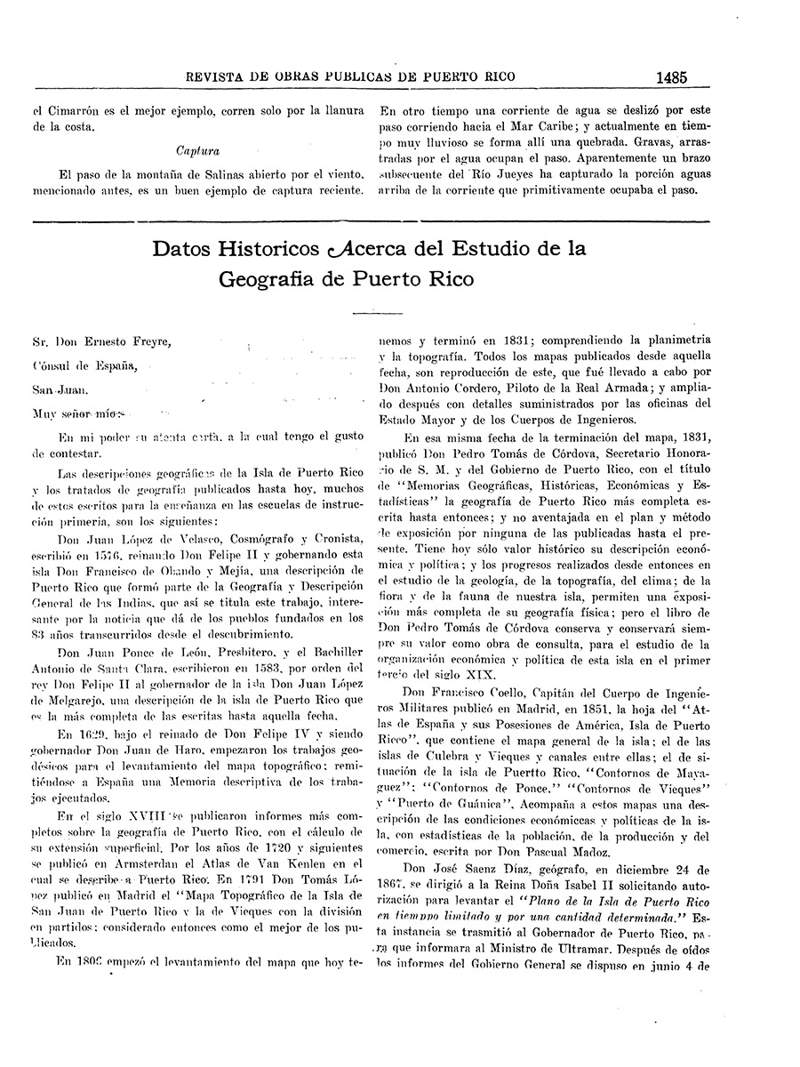 Artículo titulado “Datos históricos acerca del estudio de la geografía de Puerto Rico” por Ramón Gandía Córdova, publicado en la edición de enero de 1928 de la Revista de Obras Públicas de Puerto Rico. Este artículo, una reproducción de la carta enviada por el autor al Sr. Don Ernesto Freyre, Cónsul de España, hace un recuento de los mapas de Puerto Rico y los libros sobre su geografía publicados hasta 1928. Es un excelente recurso para cualquier investigación sobre la historia de la geografía de la isla.