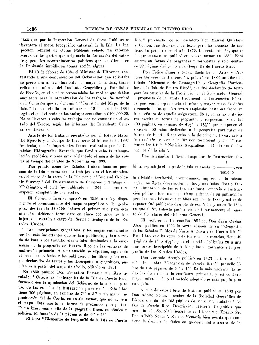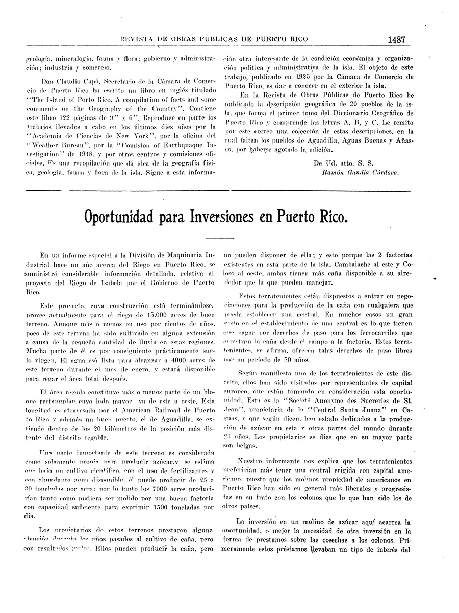 En la Revista de Obras Públicas de Puerto Rico he publicado la descripción geográfica de 20 pueblos de la isla, que forma el primer tomo del Diccionario Geográfico de Puerto Rico y comprende las letras A, B, y C. Le remito por este correo una colección de estas descripciones, en la cual faltan los pueblos de Aguadilla, Aguas Buenas y Añasco, por haberse agotado la edición.