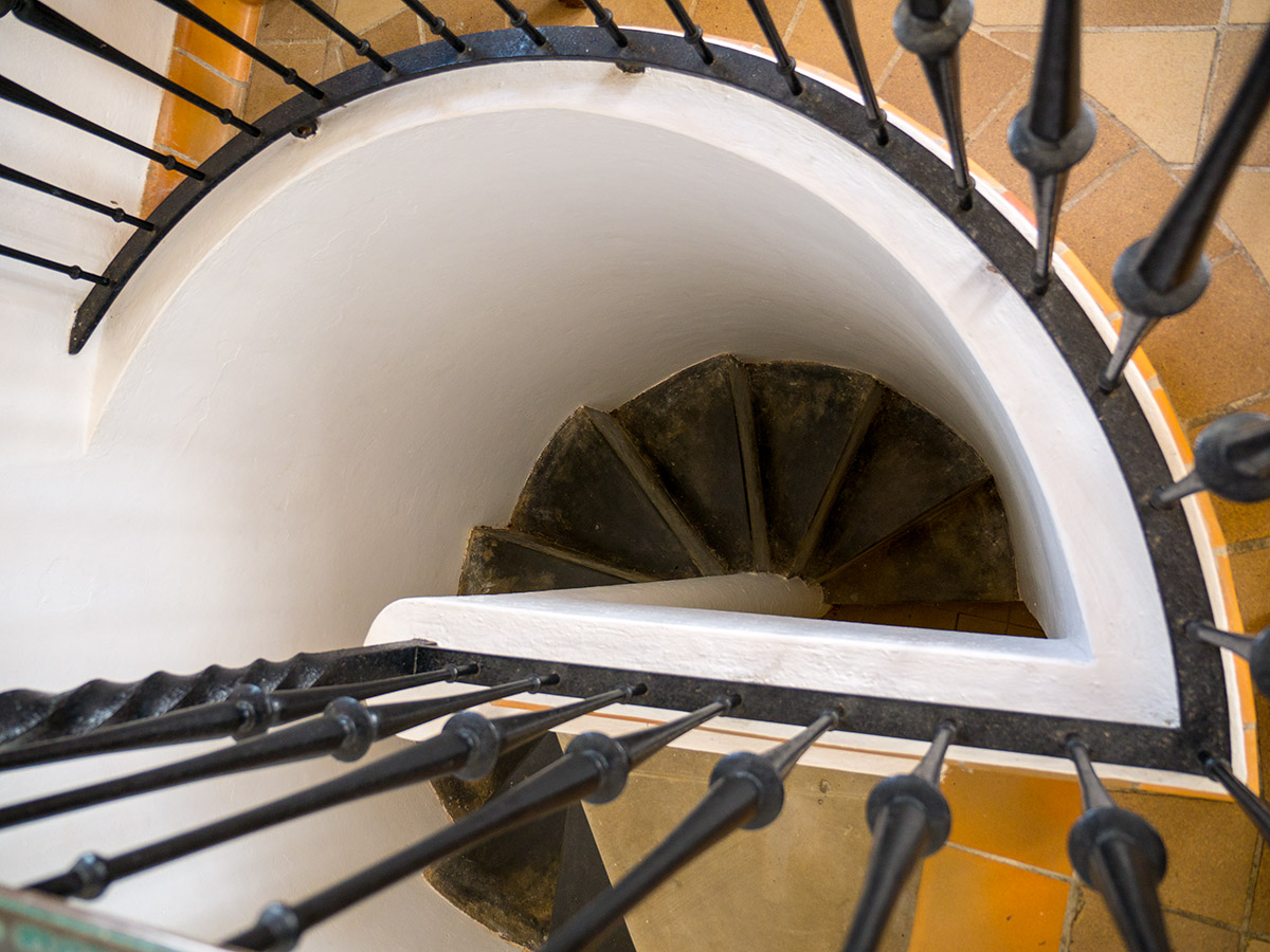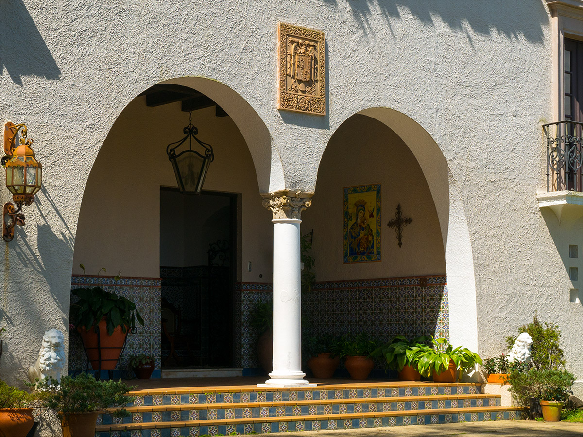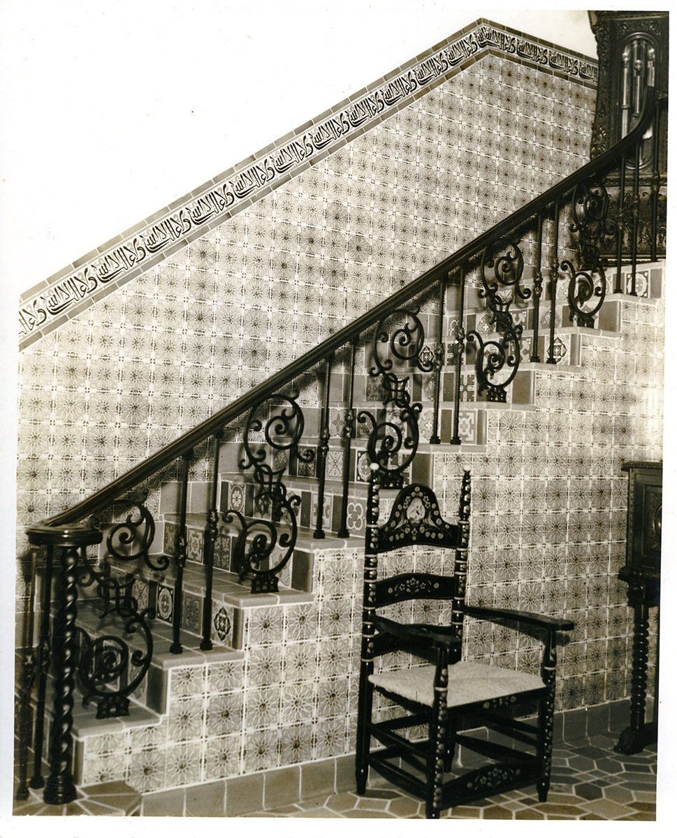 The residence is two-stories high with a tower that increases the elevation two additional floors. The garage is a one-story structure with parking for two automobiles and a basement that houses the servant’s quarters; the gardener’s cottage is also a one-story building. The buildings are constructed of reinforced concrete and the roofs are covered with terracotta tiles. The garden paths and stairs are made of brick and, the retaining walls and benches, are cladded with stone slabs.